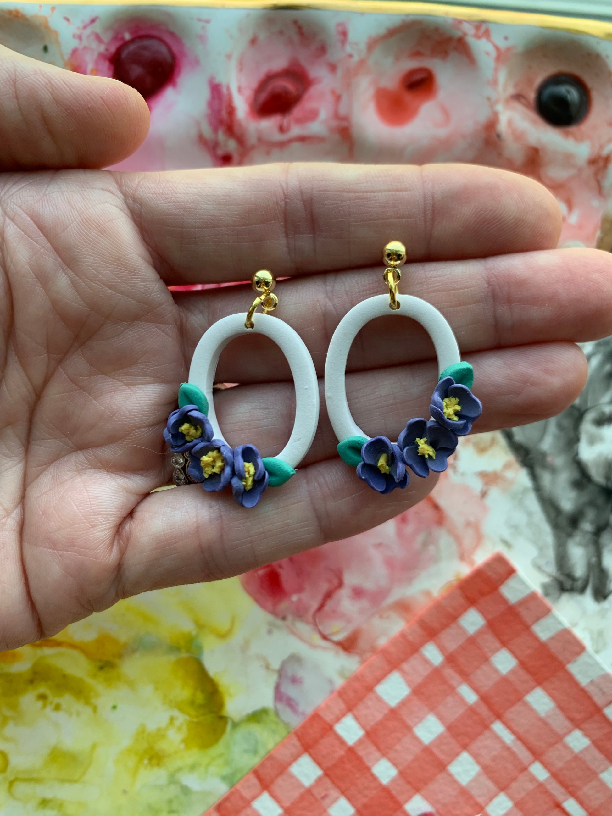 Purple flowers on a thin oval polymer clay earrings on a gold ball post.